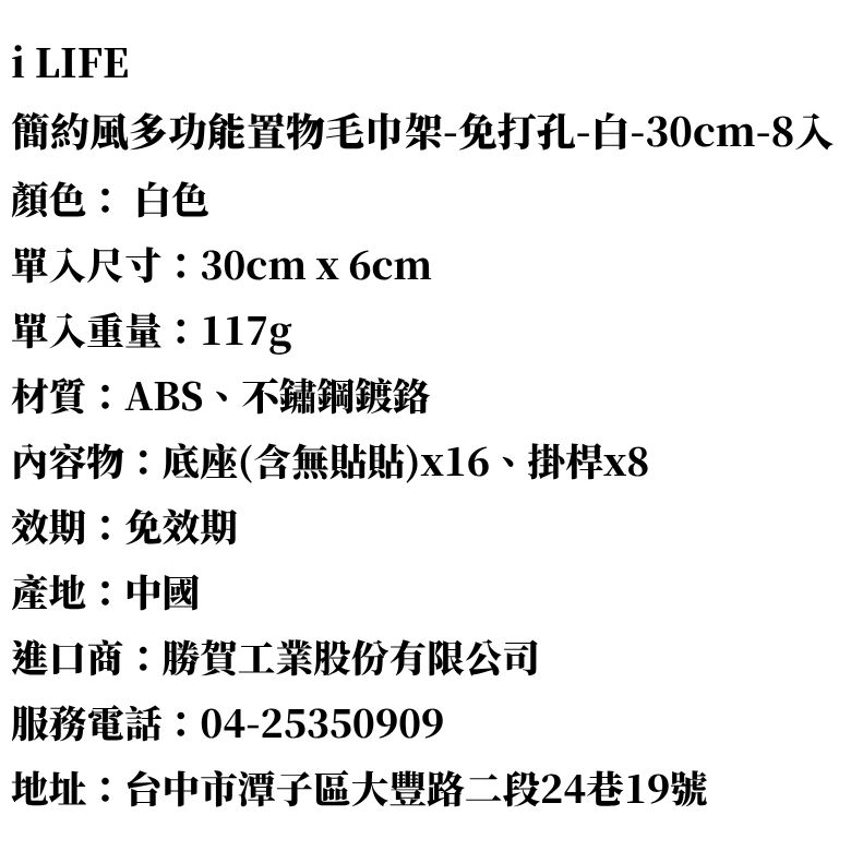 i LIFE 簡約風多功能置物毛巾架-免打孔-白-30CM-8入