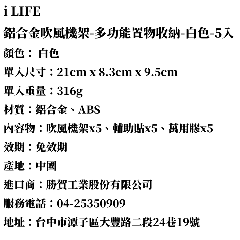 i LIFE 鋁合金吹風機架-多功能置物收納-白色-5入