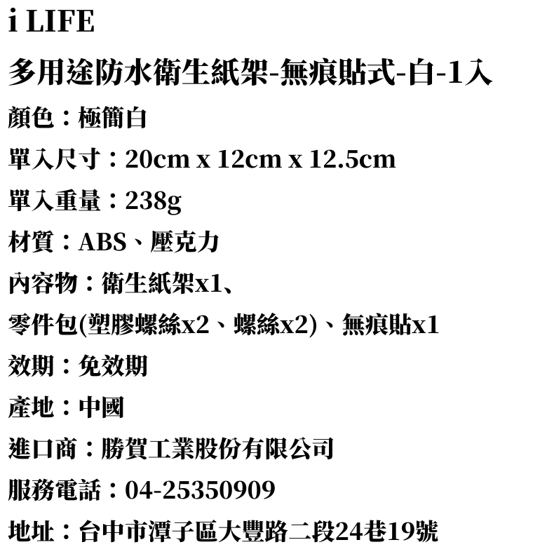 i LIFE 多用途防水衛生紙架-無痕貼式-白-1入