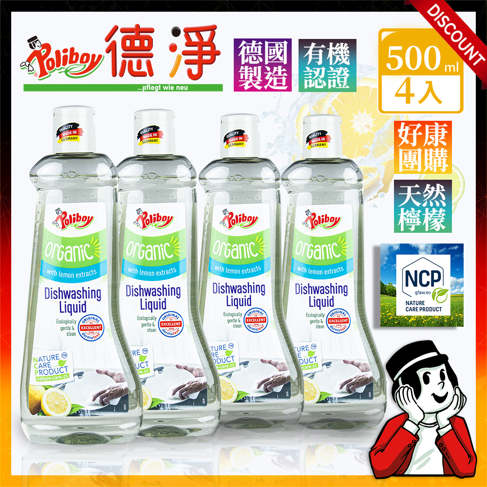 德國原裝-好康團購4入組-德淨poliboy-有機洗碗精 (天然檸檬精油) 500ml*4 台灣總代理