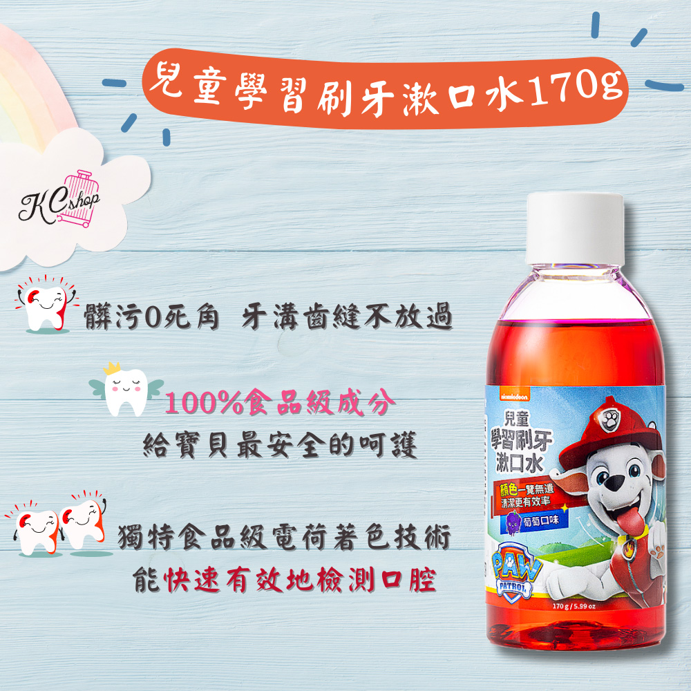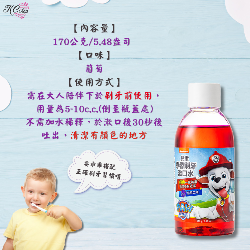 需在大人陪伴下於刷牙前使用,用量為5-10c.c.(倒至瓶蓋處)